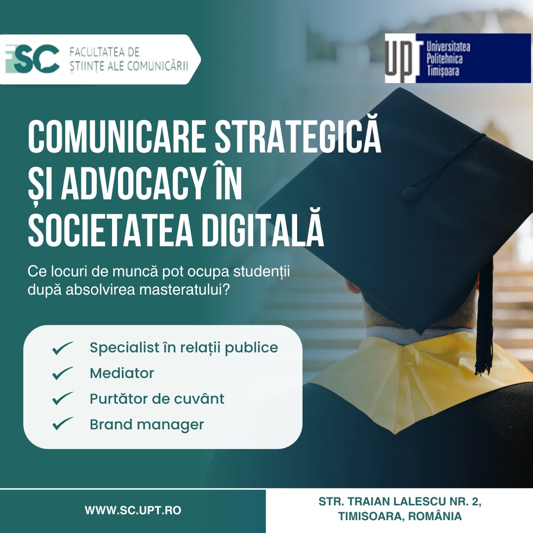 Descoperă singurul program de master din România dedicat comunicării strategice și advocacy-ului în societatea digitală. Organizator: Universitatea Politehnica Timișoara – Facultatea de Științe ale Comunicării, în parteneriat cu Academia de Advocacy.